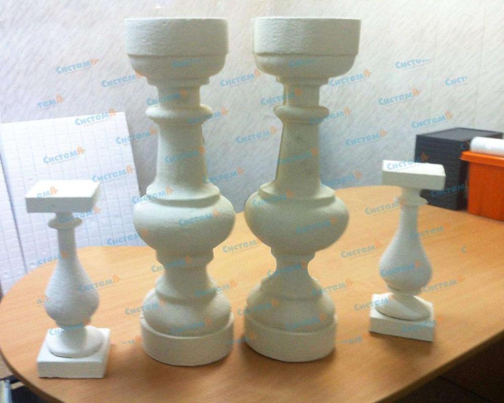 Погонажные элементы и декор с простым дизайном создаются методом контурной резки. Балясины изготавливают 3D-резкой пенопласта, которая представляет собой контурную резку одновременно несколькими струнами. Прежде чем приступить к производству необходимо создать чертеж будущего изделия. В нашем каталоге существует несколько видов балясин, однако мы можем разработать чертеж с нуля, если клиенту необходимо уникальное изделие.